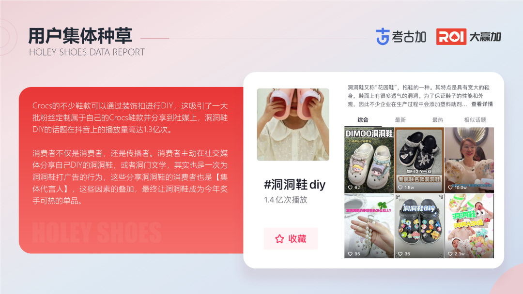 消费者不仅是消费者,还是传播者。消费者主动在社交媒体分享自己DIY的洞洞鞋,或者洞门文学,其实也是一次为洞洞鞋打广告的行为,这些分享洞洞鞋的消费者也是【集体代言人】,这些因素的叠加,最终让洞洞鞋成为今年炙手可热的单品。