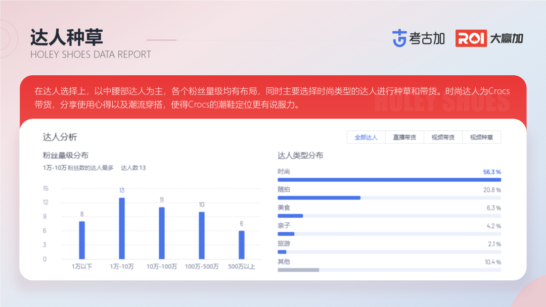 在达人选择上,以中腰部达人为主,各个粉丝量级均有布局,同时主要选择时尚类型的达人进行种草和带货。时尚达人为Crocs带货,分享使用心得以及潮流穿搭,使得Crocs的潮鞋定位更有说服力。