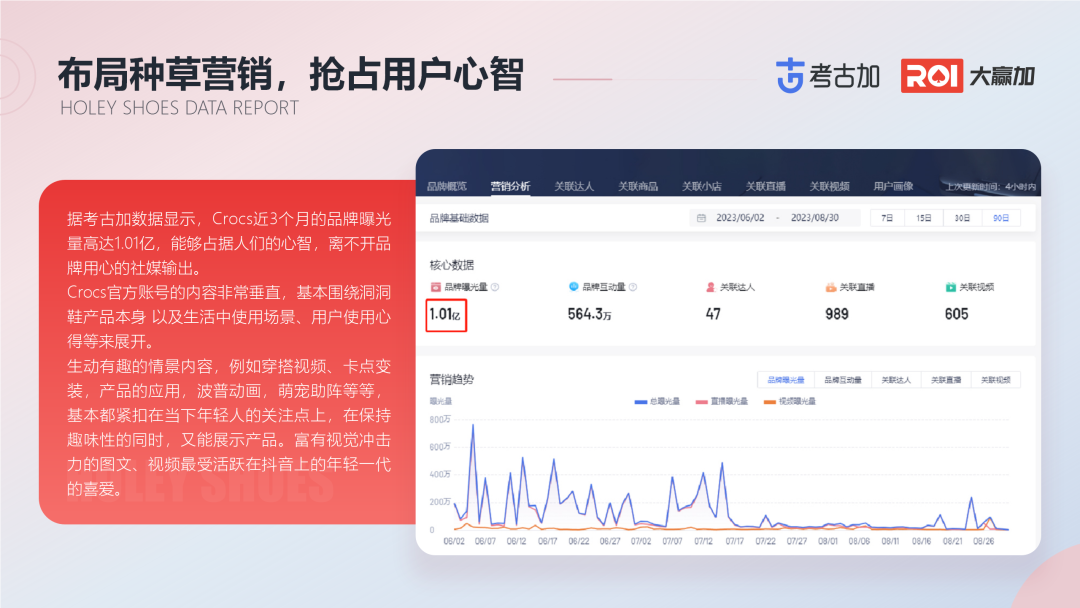 据考古加数据显示,Crocs近3个月的品牌曝光量高达1.01亿,能够占据人们的心智,离不开品牌用心的社媒输出。