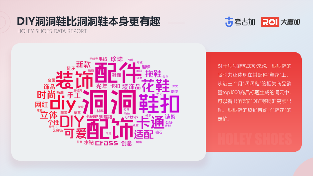 对于洞洞鞋热衷粉来说,洞洞鞋的吸引力还体现在其配件“鞋花”上,从近三个月“洞洞鞋”的相关商品销量top1000商品标题生成的词云中,可以看出“配饰”“DIY”等词汇高频出现,洞洞鞋的热销带动了“鞋花”的走俏。