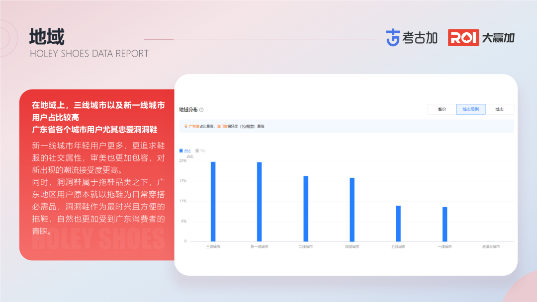 在地域上,三线城市以及新一线城市用户占比较高,广东省各个城市用户尤其忠爱洞洞鞋。新一线城市年轻用户更多,更追求鞋服的社交属性,审美也更加包容,对新出现的潮流接受度更高。