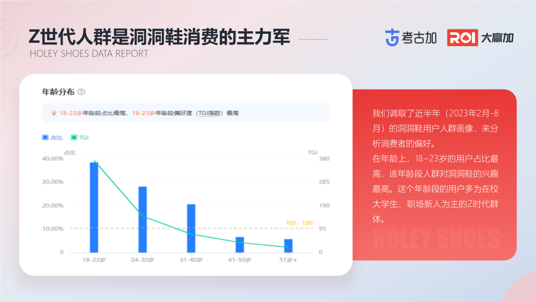 在年龄上,18~23岁的用户占比最高,该年龄段人群对洞洞鞋的兴趣最高。这个年龄段的用户多为在校大学生、职场新人为主的Z时代群体。