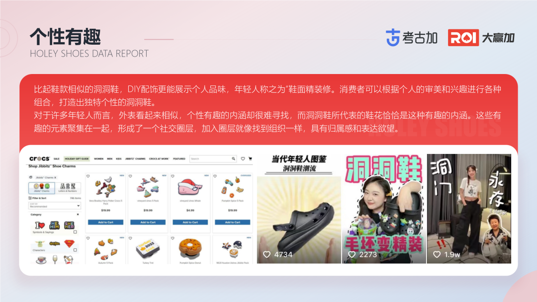 对于许多年轻人而言,外表看起来相似,个性有趣的内涵却很难寻找,而洞洞鞋所代表的鞋花恰恰是这种有趣的内涵。这些有趣的元素聚集在一起,形成了一个社交圈层,加入圈层就像找到组织一样,具有归属感和表达欲望。
