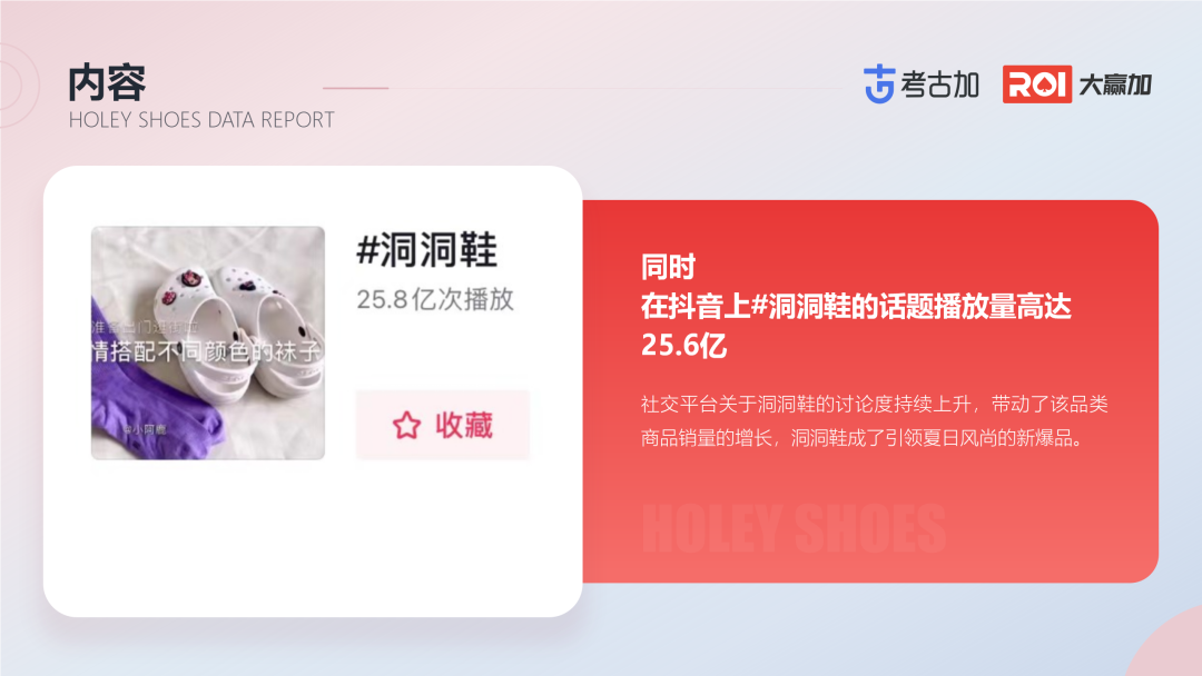 同时,在抖音上#洞洞鞋 的话题播放量高达25.6亿。社交平台关于洞洞鞋的讨论度持续上升,带动了该品类商品销量的增长,洞洞鞋成了引领夏日风尚的新爆品。