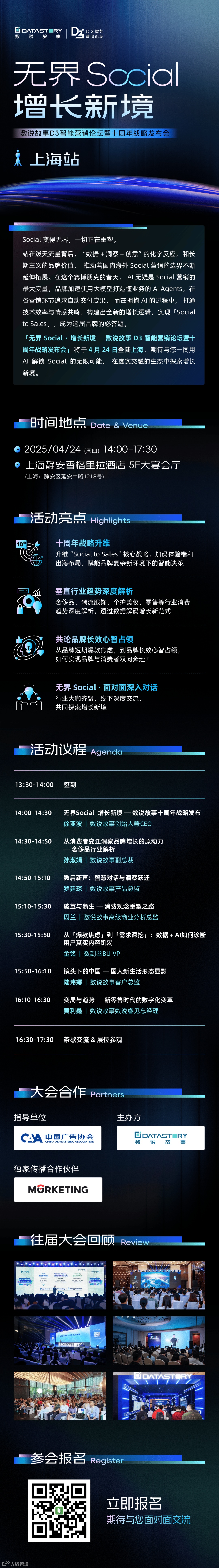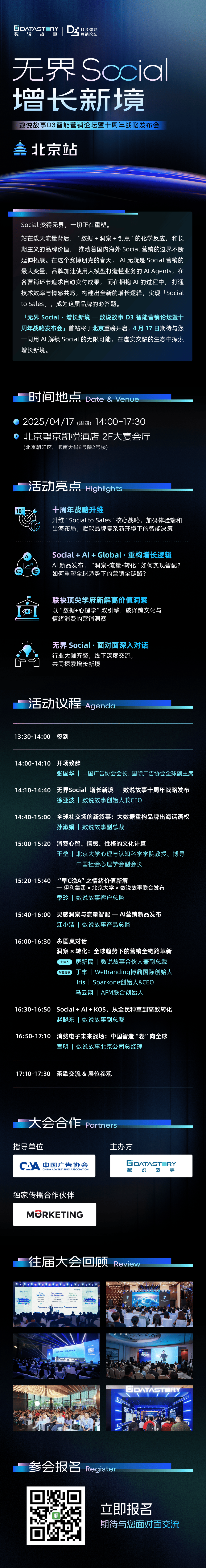 由中国广告协会指导、数说故事主办的「无界Social · 增长新境——数说故事D3智能营销论坛暨十周年战略发布会」将双城联动重磅开启,4月17日首站将登陆北京,4月24日闪现上海。现场将发布数说故事十周年战略,还会带来数说故事在营销领域「Social+AI」更前沿的趋势洞察、技术应用和实战经验,从技术升维到心智深耕,从全球链路到行业解码,期待与您一同用AI解锁Social的无限可能,在虚实交融的生态中探索增长新境。