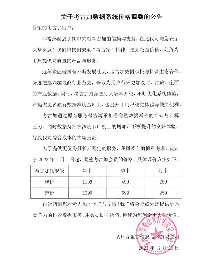 为了提供更优秀且长期稳定的服务,我司经全面慎重考虑,决定于2023年1月1日起,调整考古加会员的价格。具体调价方案如下: