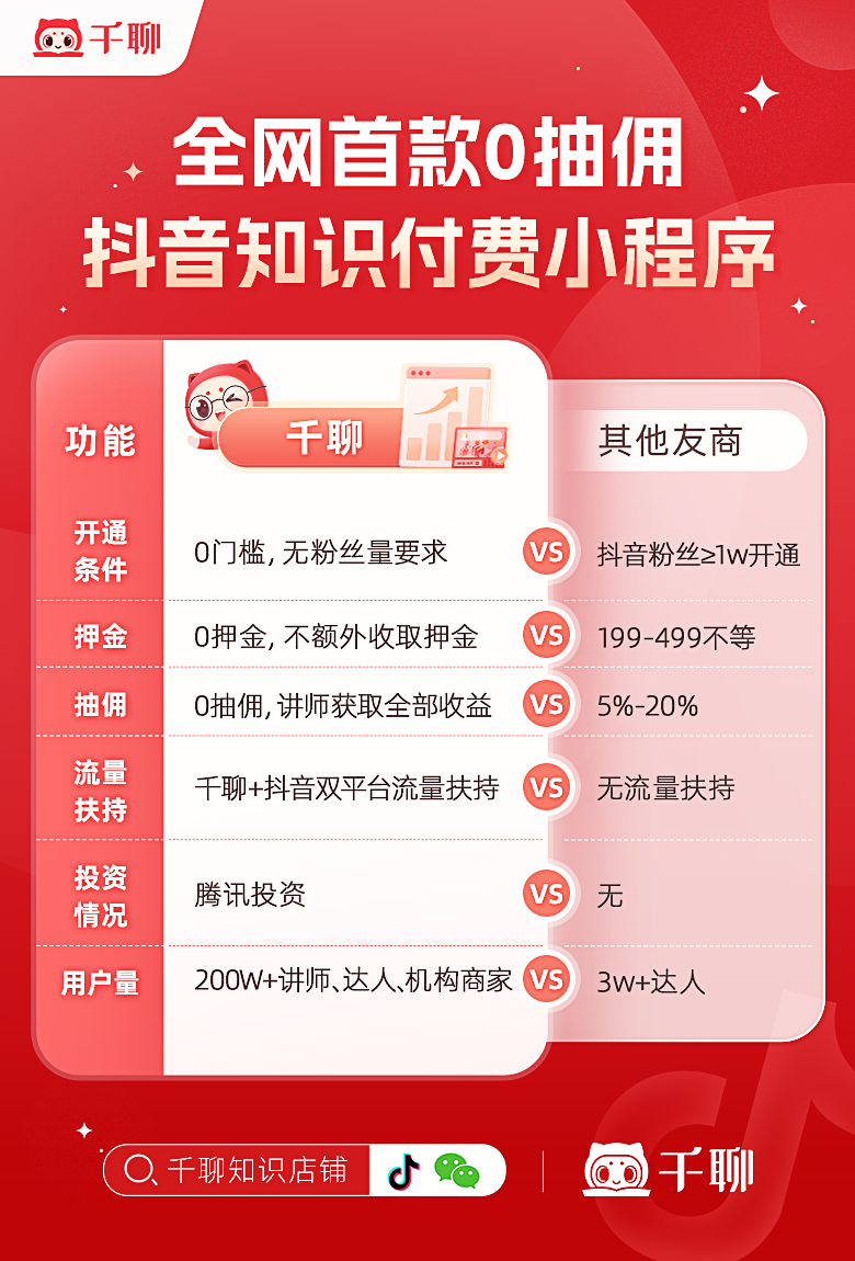 作为免费全面易用的知识服务工具,千聊结合讲师们实际的带课需求与平台优势,推出全网首款0门槛、0抽佣、0押金、无需ICP备案的抖音带课小程序,正式上线!