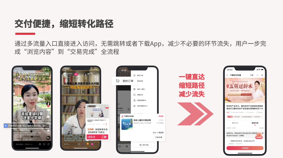 千聊抖音带课小程序,为讲师提供一站式抖音带课解决方案。整合视频、直播、订单中心等多位置触达用户、持续获客引流。