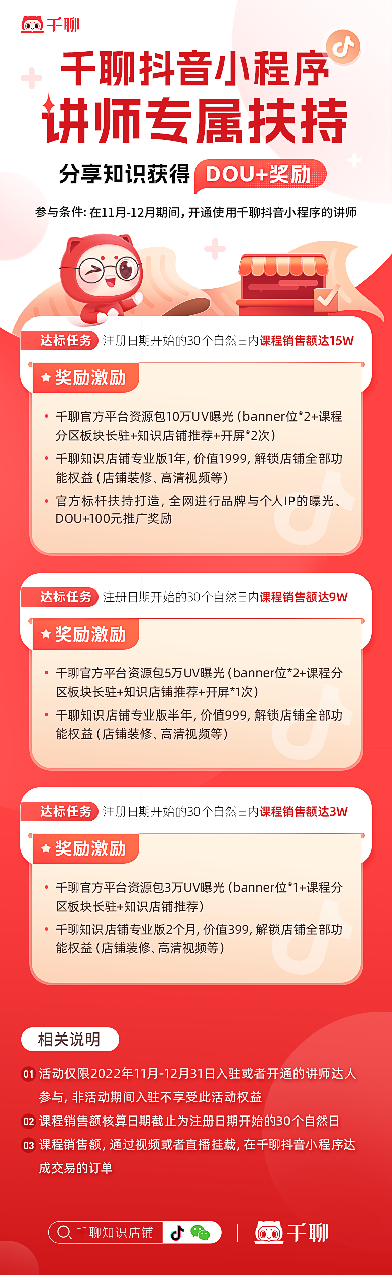 为帮助更多知识付费讲师在抖音带课之路上快速成长,传播知识实现内容变现。在11月-12月期间,开通并使用千聊抖音带课小程序的讲师,将有机会获得千聊抖音小程序讲师专属扶持。