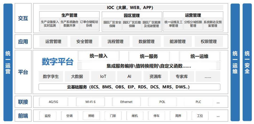 在园区管理方面,该方案可以提供园区厂区的安全保障,支持园区厂区的后勤保障,并实现园区厂区的能源及低碳管理;