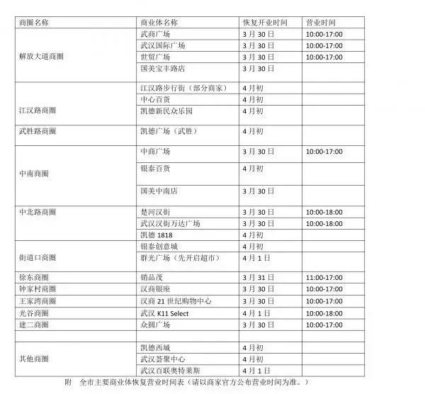 附:全市主要商业体恢复营业时间表(请以商家官方最终公布营业时间为准。)