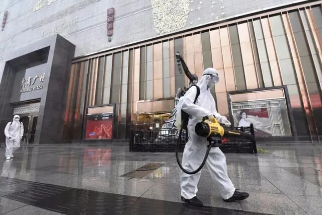 商场外还配有身穿防护服在工作人员为马路路面消毒,保障每一位顾客的安全。