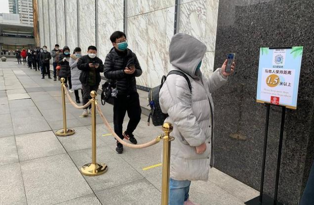 上午9时,已经有部分顾客在武商广场门外排队等候。商场入口处设置体温监测点,市民持健康码“绿码”扫码登记,经测量体温正常、佩戴好口罩方可有序进入商场。