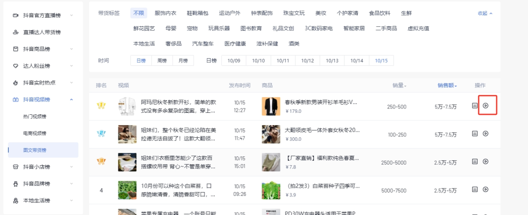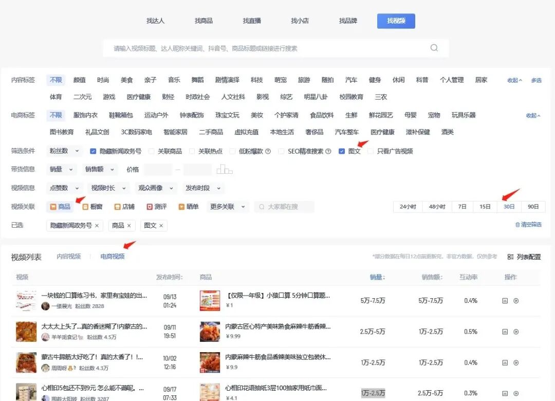 七分选品三分运营,产品选的好闭眼都能爆。通过考古加视频入口,勾选图文、点击商品、电商视频,可以清晰看到近日内哪些品类带货趋势更佳。
