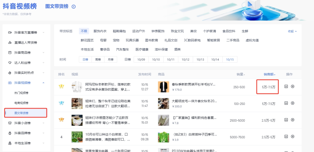 在考古加最近新上线的「图文带货榜」日榜中可以看到,前10名中,有7位的粉丝都不到5w,如粉丝数仅3708的达人 @乐干面 仅用一条图文,一天就卖出了5w-7.5w的销售额,勇夺10月15日【图文带货日榜】第一。