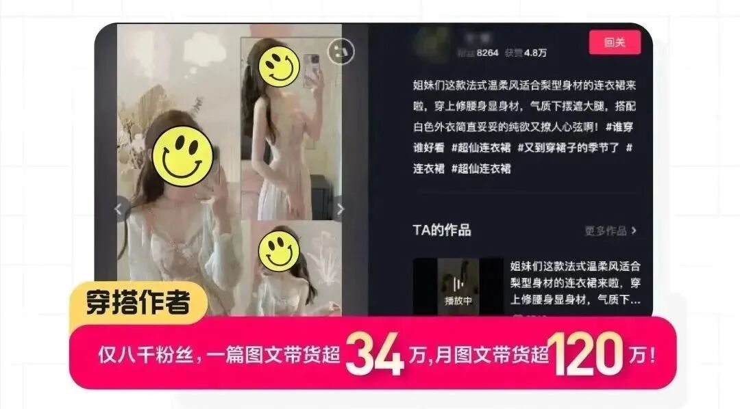 一位粉丝量仅为8000+的穿搭博主,靠2张图片、几行文字、一段音乐,带货高达34万。