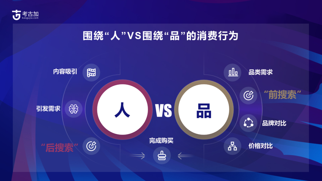 围绕“人”和围绕“品”的消费行为即全域兴趣电商最佳诠释。围绕“人”,通常称为「后搜索行为」,与传统关于品的维度搜索有所不同,品即品牌,围绕“品”是「前搜索行为」,有需求再去搜索品牌,比如说今天要买安踏,通过直接搜这几个字来寻找商品。而基于“人”的搜索则是用户先看到内容,产生兴趣了再去搜索这个商品。