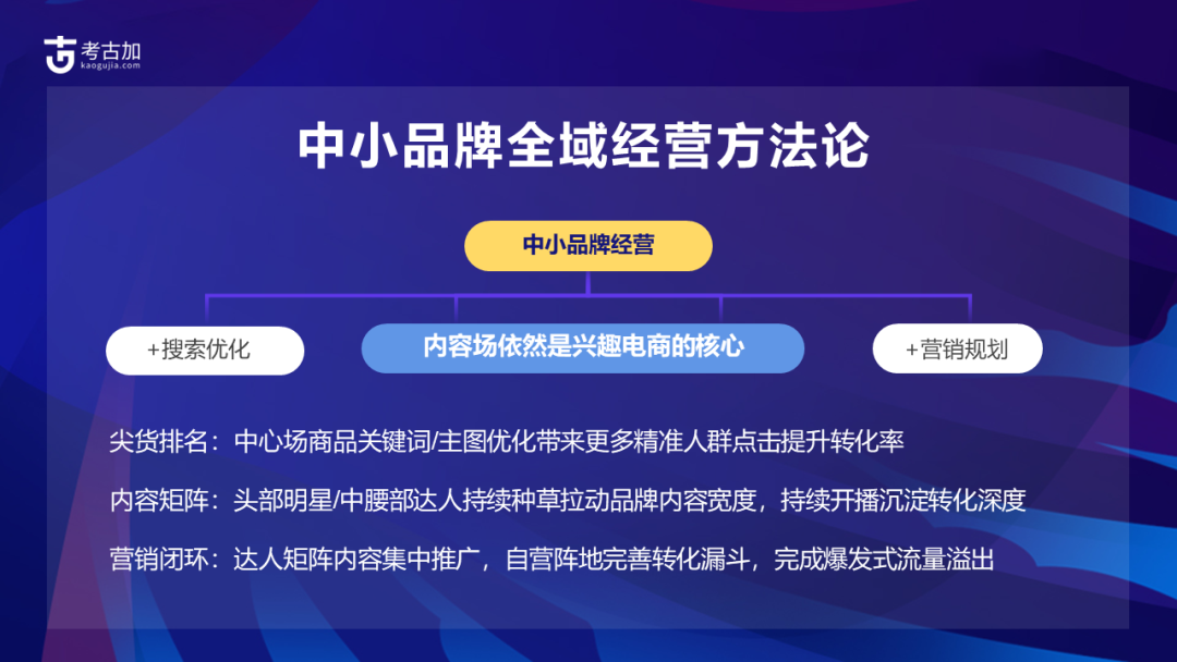 相较于成熟品牌,中小品牌在知名度、资源上等虽有差距,但也有自己的优势和一套打法。进入全域兴趣电商时代,人货场的逻辑有了新的变化,打通“货找人”和“人找货”的双向消费链路是新的增长路径。