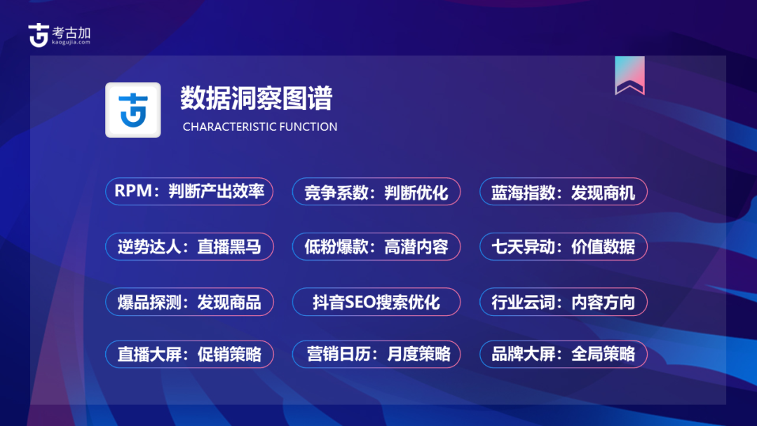 考古加为品牌提供数据洞察图谱独特解析工具,对抖音生态数据进行全面且深度的商业价值挖掘,包含了逆势达人、爆品探测、抖音SEO搜索优化、营销日历等模块,辅助操盘手数据洞察,实现应用提效。