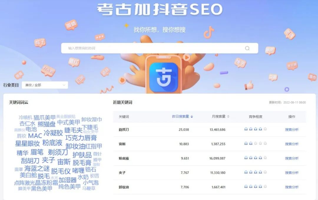 前不久,在考古加周年庆上,正式推出了【抖音SEO搜索优化】和【品牌数据】两大功能。