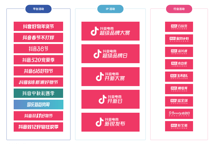 而抖音电商的官方活动的出现,很大程度上填补了这一痛点,帮助新品牌实现品效双爆发。包括营销活动(全年平台和行业活动:大促节点、日常节日)和营销 IP(平台IP:抖音电商超级品牌日等;行业IP:抖in宝贝计划等)