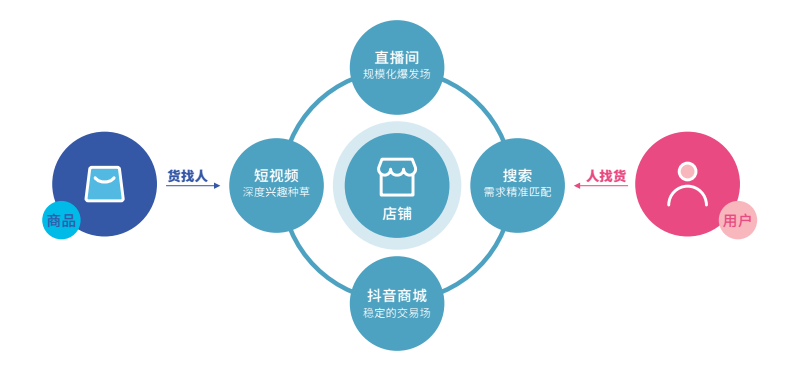 商家们的经营范围从短视频、直播的“内容场域”拓宽至商城和搜索等“中心场域”。这也意味着,抖音电商打通了从“货找人”到“人找货”的双向消费路径。