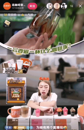 在与用户的交互方式上充分利用直播快速直观的视觉效果,结合动效、视频、长镜头,把磨豆子的香气、咖啡机萃取咖啡油脂的过程、倒入牛奶分层的画面强烈的展示与表达,形成了非常高的转化效率。