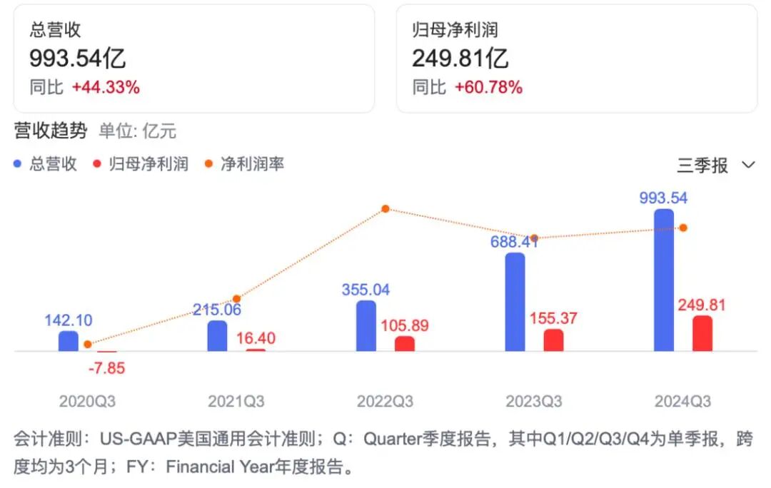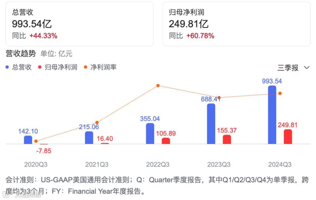 财报显示,拼多多第三季度总营收为994亿元,同比增长44%,虽然略低于市场预期的1028亿元。归属于拼多多普通股股东的净利润为250亿元,同比增长61%,同样未能达到市场的预期值292亿元。营收和净利润增速的放缓主要源于拼多多在加大平台生态建设投入,包括推出一系列扶持商家的措施,如“百亿减免”和“新质商家扶持计划”等。