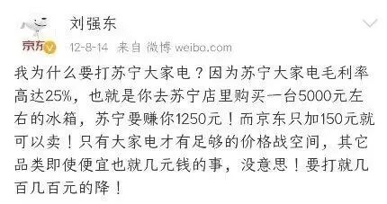 第二次瞄准了苏宁的大家电市场,刘强东彼时说,“没有耐心陪着苏宁10元10元的降价了,今日上午直接发放满2000减300元和满3000减500元的大家电优惠券,一步到位!”。