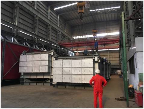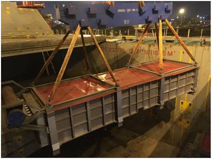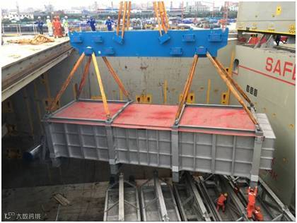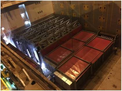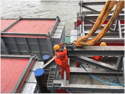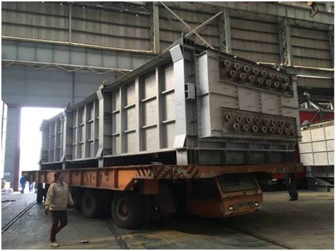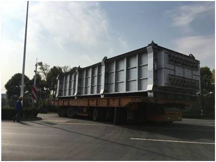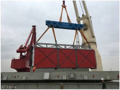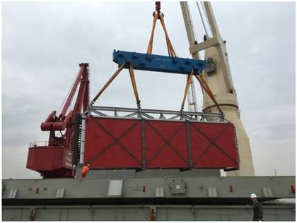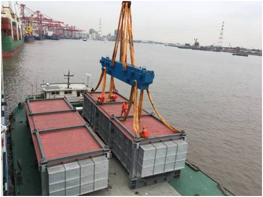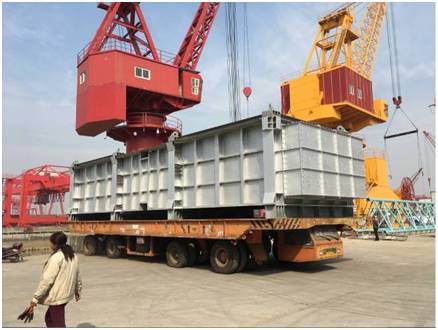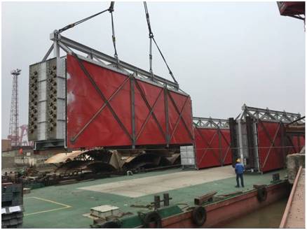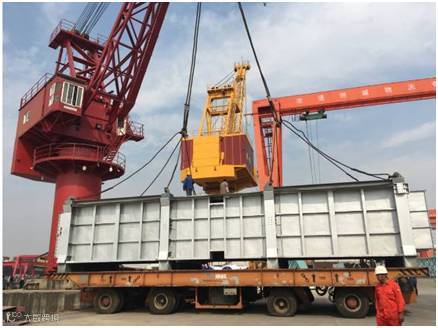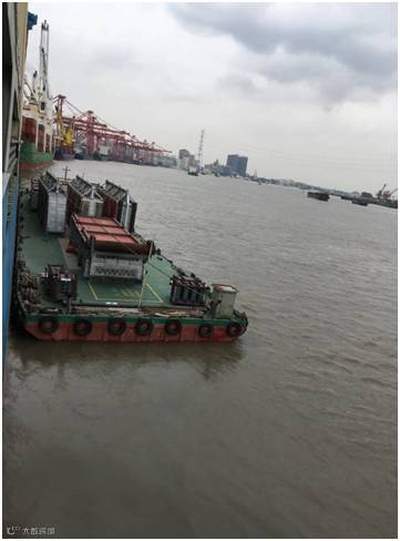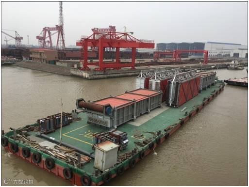 该批项目货物共18件,其中单件130-150吨的大件设备8件。货物由液压模块车从南通工厂转运至最近的内贸码头,然后安排2条驳船从南通码头转运至上海张华浜码头。高度6.4m的货物,用电焊将货物底部支架与船体焊接,以保证运输安全。
