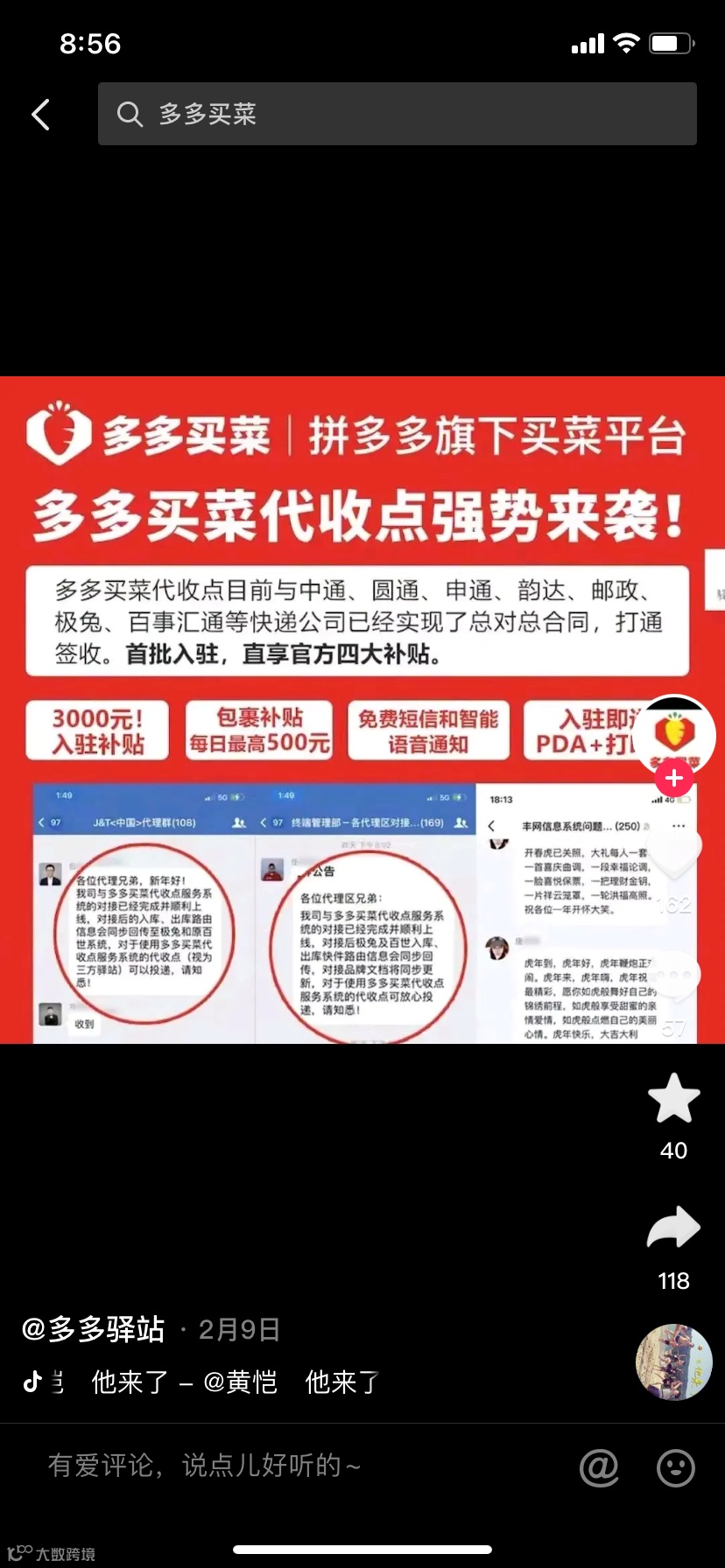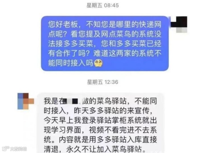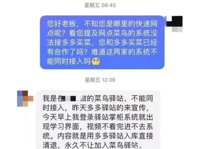 “前天菜鸟驿站区域经理跟我说如果有多多买菜的人来推广就告诉他,我跟他说了之后,直接跟我说不能合作,否则清退。”在阿伟看来,多多买菜目前只做了第三方系代收点服务系统,还没有直接自建驿站,但已经让菜鸟感受到了压力。