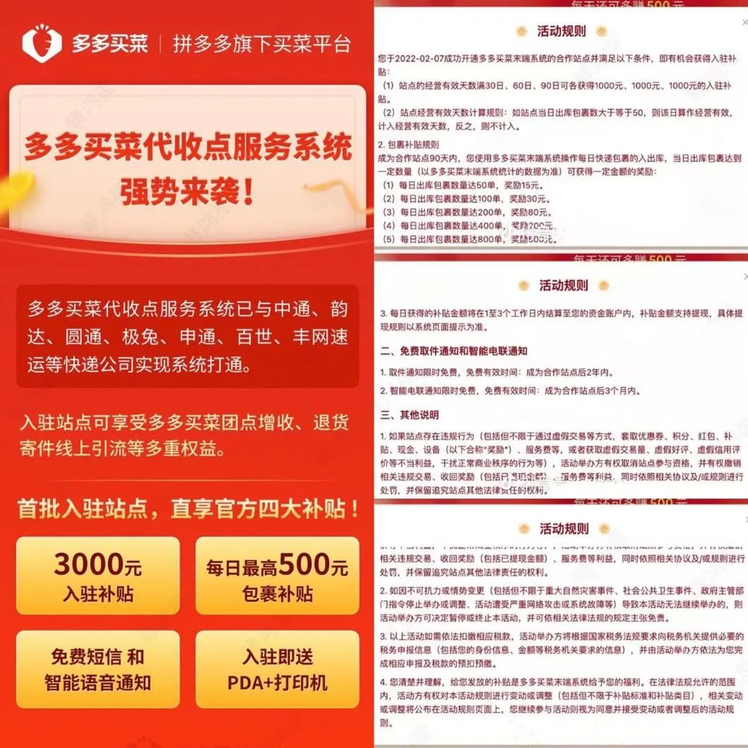 根据这次活动显示,首批使用多多买菜系统的代收点可享受四大补贴,包括3000元入驻补贴、包裹补贴每天最高500元、免费短信和智能语音通知、入驻即送PDA与打印机等。
