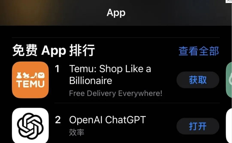 瞬间冲上苹果商店免费榜第二名(第一仍然是拼多多海外版),效率榜第一名。