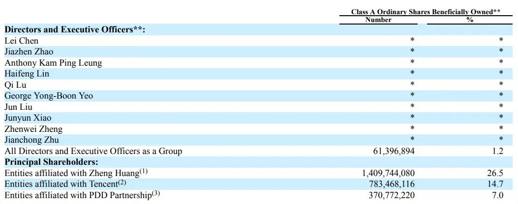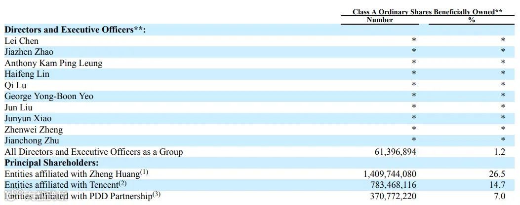 5月3日,拼多多日前向美国SEC递交了20-F文件。文件显示,截至2023年2月28日,拼多多创始人黄峥持股为26.5%;腾讯持股为14.7%;拼多多合伙人集体持股为7%;拼多多管理层一共持股为1.2%。