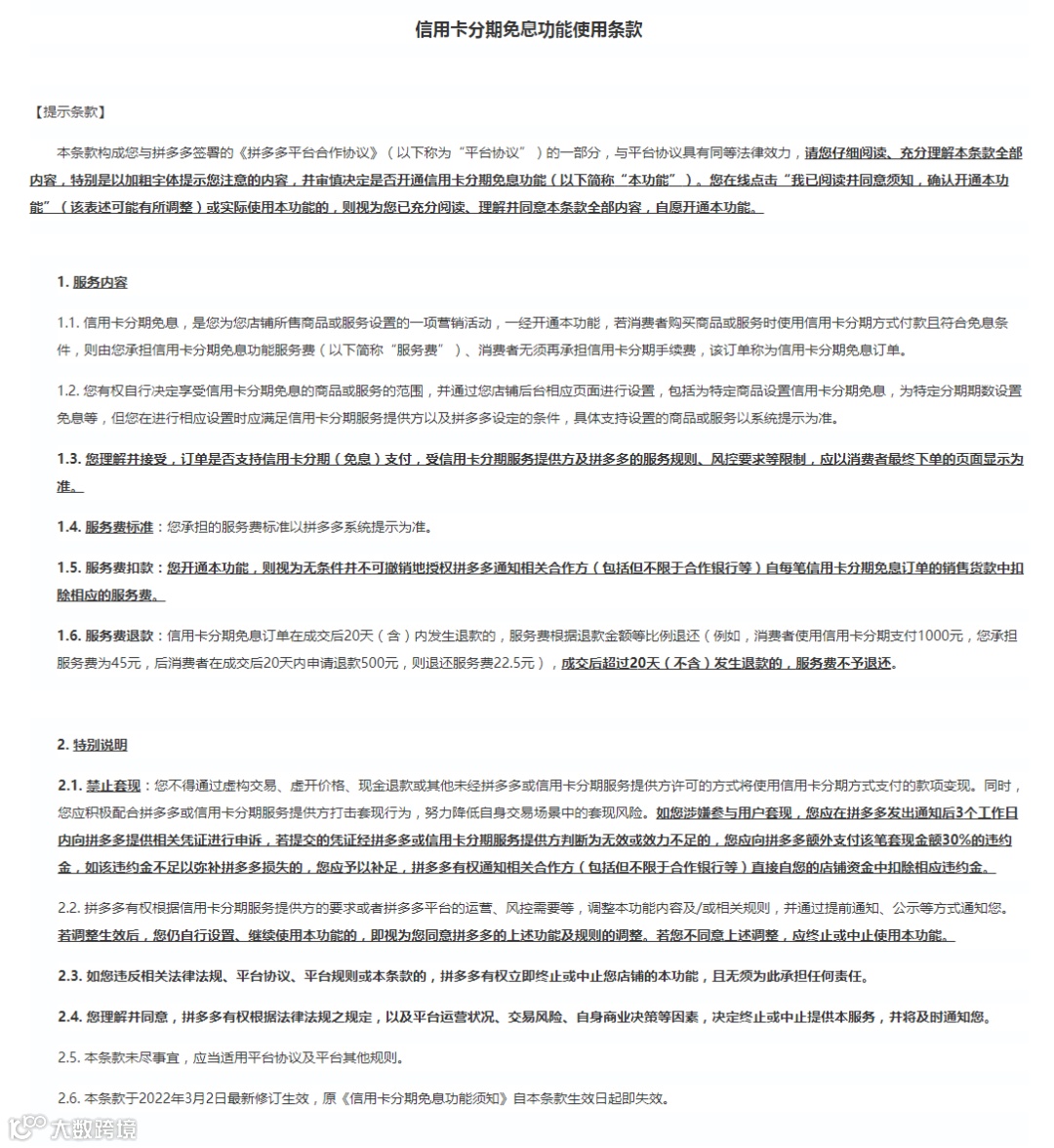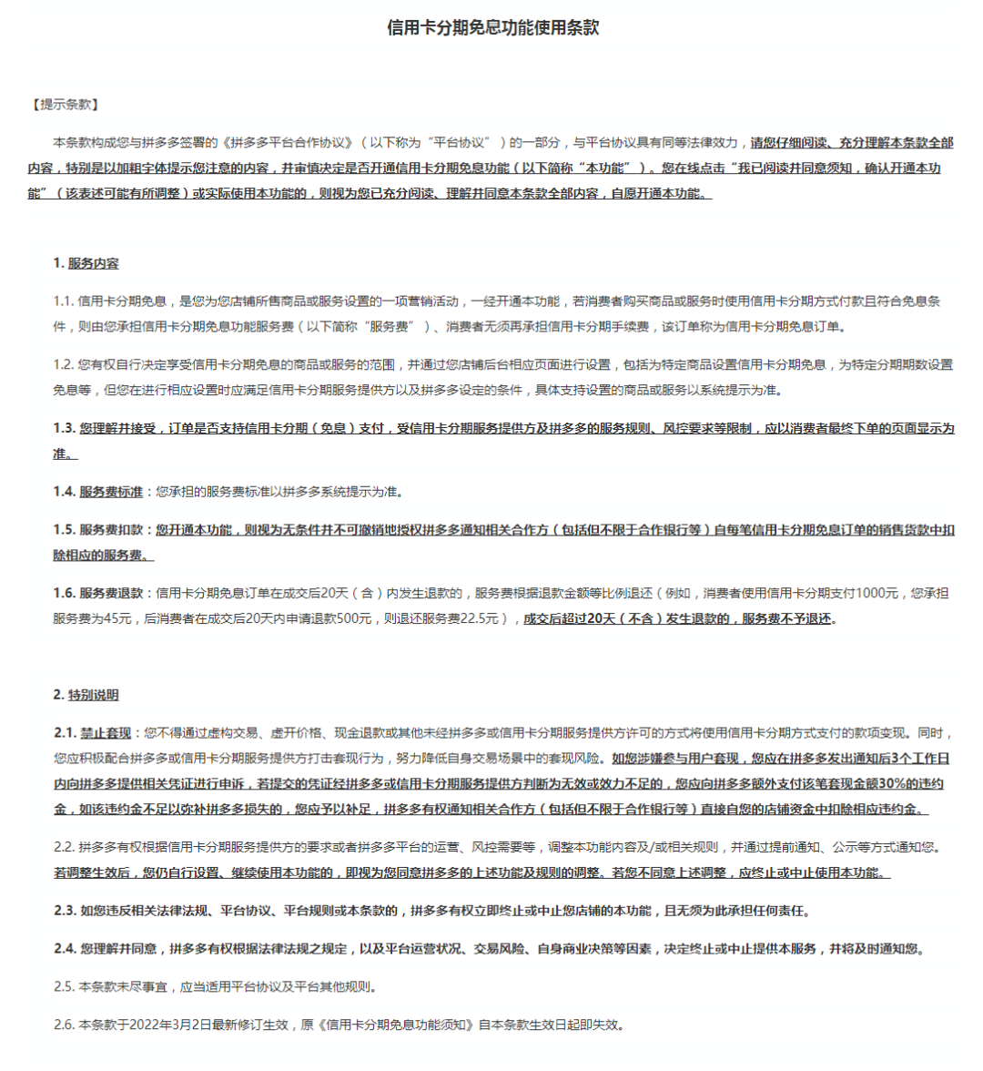 拼多多官网平台为维护平台运营秩序,提升用户体验,特修订了《信用卡分期免息功能使用条款》,并于2022年2月22日进行公示,该条款已于2022年3月2日生效。