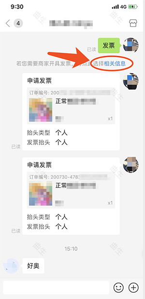 如果买家在客服聊天页面提到了“发票”这2个字,那么系统就会引导他选择订单及填写抬头。点击【相关信息】,系统会给出可开发票的订单列表。