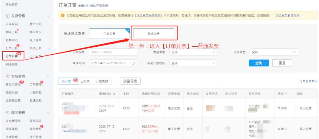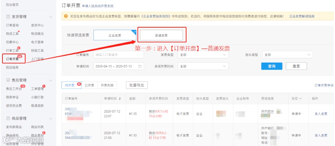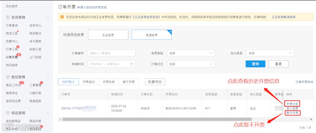 我们可以在【商家管理后台】-【发货管理】-【订单开票】的界面中,点击【普通发票】,在出现的页面上,查看【待开票】的订单。