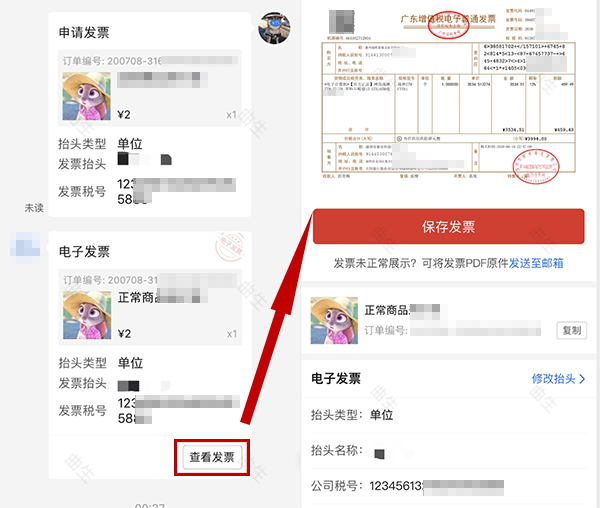 发票录入完成后,买家可以在与商家的客服聊天窗口或订单详情中查看对应发票。