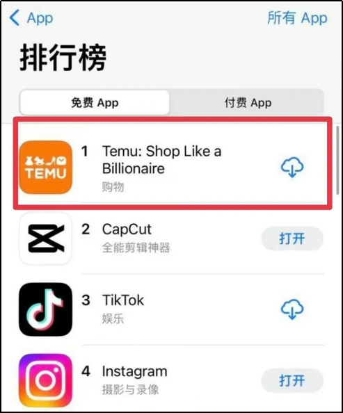 另有相关数据显示,Temu在美国的免费购物应用排行榜上已经霸榜170天,在加拿大是120天,在澳大利亚是20天,在新西兰则是39天。