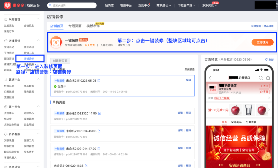 路径:店铺营销 - 店铺装修 - 店铺首页 - 一键装修