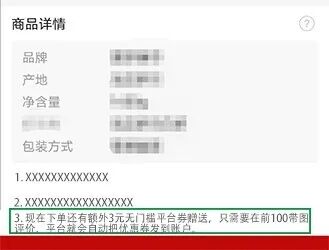 “购买这款商品,还有额外的3元优惠哦,限量XXX张,你只需要晒出真实优质的评价就可以获得。”