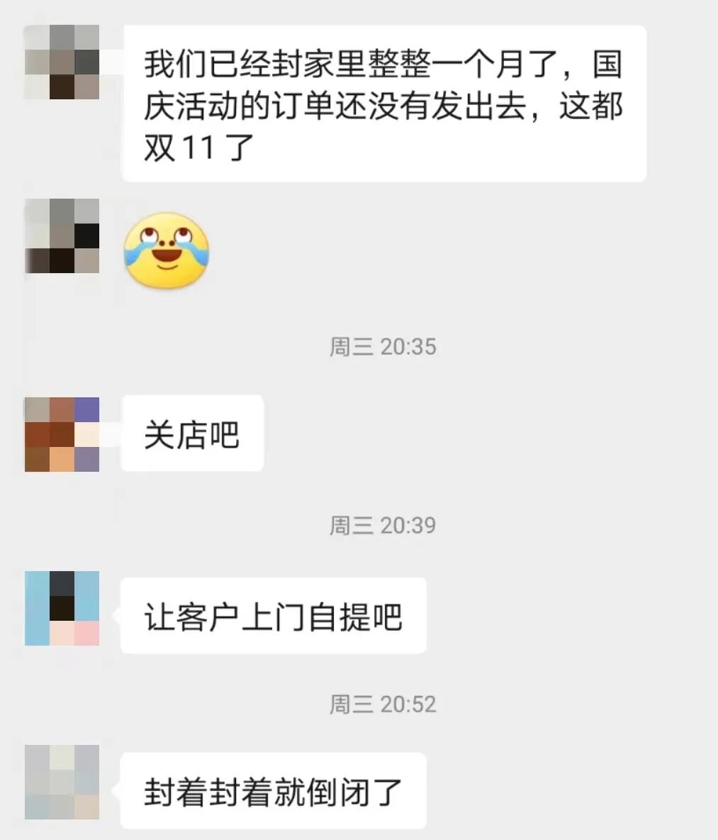 近段时间,广东、上海、北京等城市疫情反复,多地快递出现停发,商家的生意受到严重影响。有电霸气氛组表示,已经被封在家整整一个月,国庆活动的订单都还没发完;也有电霸气氛组称,已经被封麻木了,现在店铺销售额哐哐往下掉,再封下去店铺要倒闭。