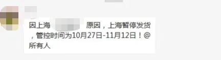 10月26日(第二天),就有商家在电霸的气氛群里发了一张截图“极兔也不可以发上海了”。“因某原因,上海暂停发货,管控时间为10月27日-11月12日”。
