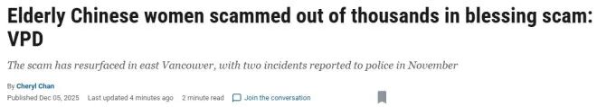 其中一名骗子陪同受害者坐公交前往银行,诱使她从保险箱中取出12万加元现金。骗子假装进行“祈福”,随后带着所有贵重物品消失。