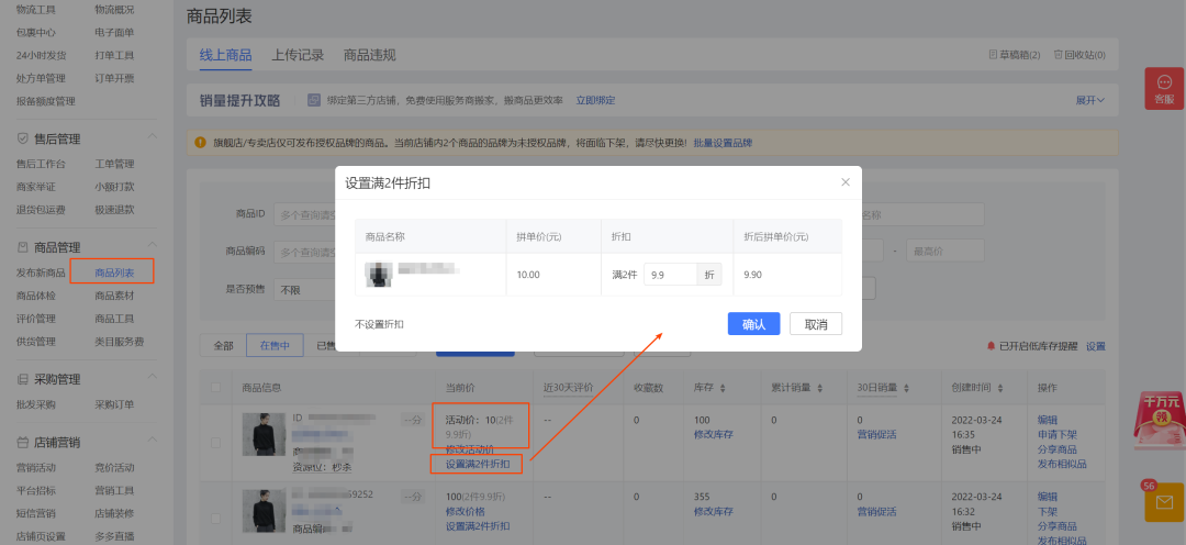 如今平台部分活动,如百亿补贴、断码清仓、9.9、限时秒杀等,要求商品报名活动时,不仅单件价格全网最低,也要求购买多件的折后价也是全网最低,因此商品在报名活动时,商家朋友们也可以同步给商品设置满2件折扣。