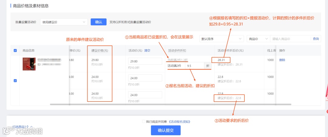2、如下图所示,若活动要求多件多折,则报名时,商品列表中,会要求填写提报信息:活动多件折扣,并展示多件的折后价格:活动多件折后价(元);