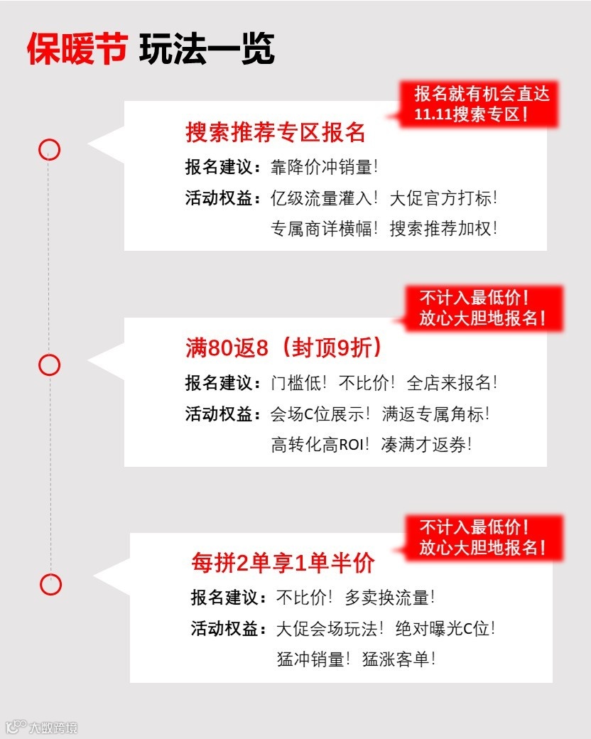 降温了!保暖节闪亮登场!寒露以来,步入深秋,南北用户对于保暖的需求将大大增加!对于广大商家而言:正是做换季生意的好时机!建议保暖相关的类目火速报名,降温生意稍纵即逝!此外,报名本次活动更有机会直达11.11内场且部分活动史上第一次不计入最低价,让商家的报名无后顾之忧!