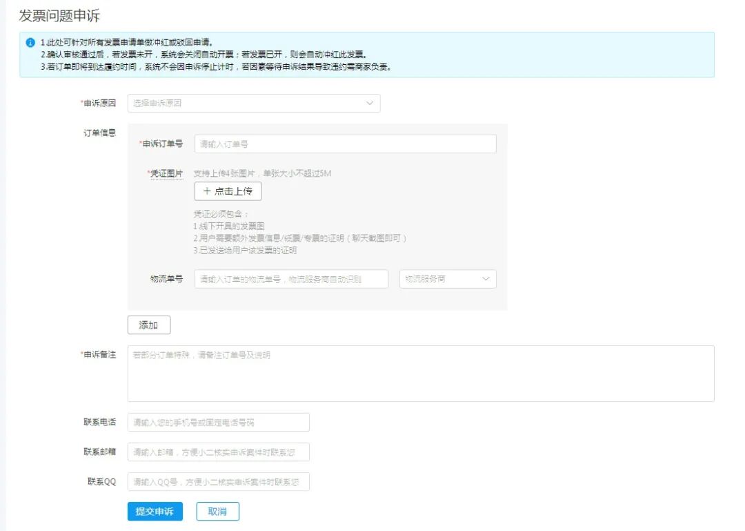 点击之后进入以下界面就可以进行下一步的发票问题申诉啦,请务必按照页面的填写说明进行正确填写哦!