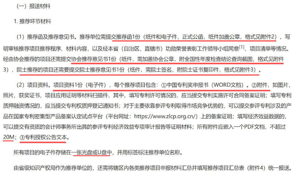 (2)项目资料。项目资料1份(电子件),每个推荐项目包含:①中国专利奖申报书(WORD文档)。②附件,如图片、照片、获奖证书、项目应用证明等材料扫描件,其中,填写专利许可情况的,应当提交专利实施许可合同备案证明;填写专利质押融资情况的,应当提交专利权质押登记通知书;对于主要依靠参评专利取得市场竞争优势的,可以提交参评专利涉及的产品在国家专利密集型产品备案认定试点平台(平台网址:https://www.zlcp.org.cn/)上的备案证明;填写经济效益数据的,可以提交有资质的会计师事务所出具的参评专利经济效益专项审计报告等证明材料;所有附件应嵌入一个PDF文档,不超过20M;③专利授权公告文本。