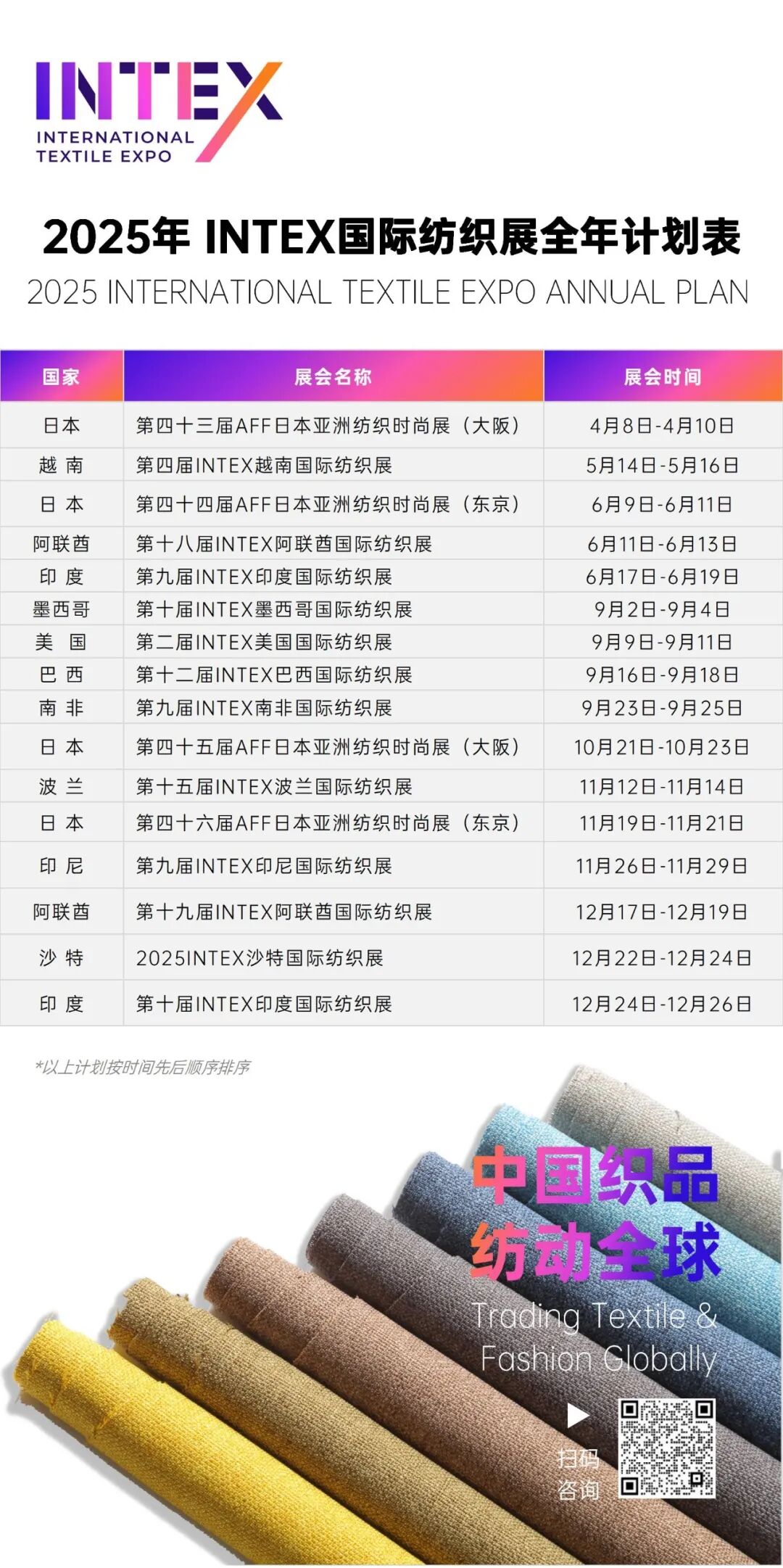 2025年,INTEX国际纺织展将在越南、印尼、阿联酋、日本、美国、南非、波兰、墨西哥、巴西、印度、沙特阿拉伯等全球重点纺织地区举办15+场专业纺织服装展,展品范围涵盖原材料、纱线、面料、辅料、服装服饰、家纺及面料、箱包、鞋业、纺织机械、纺织设备等各细分领域,聚焦一带一路、RCEP、金砖国家经济带,发掘新兴市场商机!